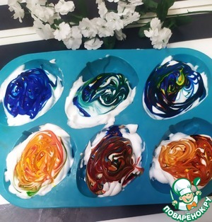 Капнуть по 2-3 капли красителей разных цветов в каждый отсек с пеной для бритья. Я использую гелевые красители, так как они дают более яркие цвета.