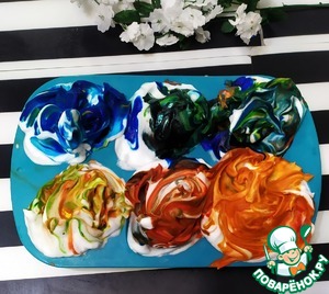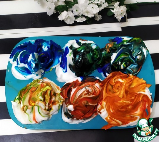 При помощи зубочистки аккуратно смешать красители и пену для бритья. Но не до однородности, так будет разнообразнее фактура цвета.