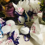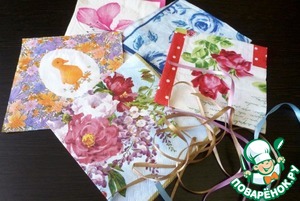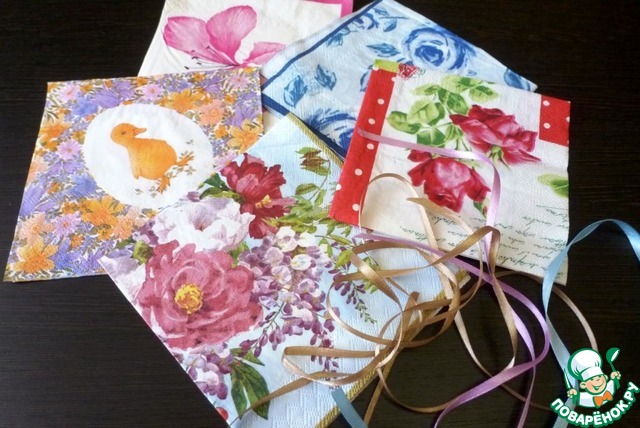 Для декора салфетками потребуются яркие и красивые салфетки размером 20 см на 20 см и тонкие ленточки разных цветов.