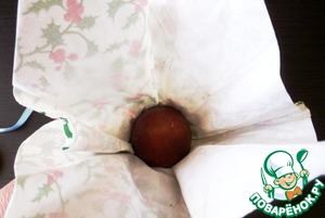 В середину салфетки поместить тупым концом яйцо. Аккуратно, красиво и ровно закладывая складки, собрать концы салфетки вверх к острому концу яйца.