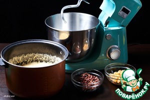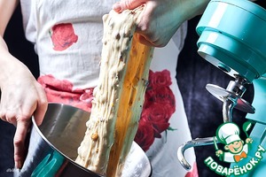 Тесто выложить в чашу и начать вымешивать насадкой крюк. Первый этап 5 мин.