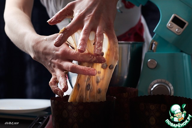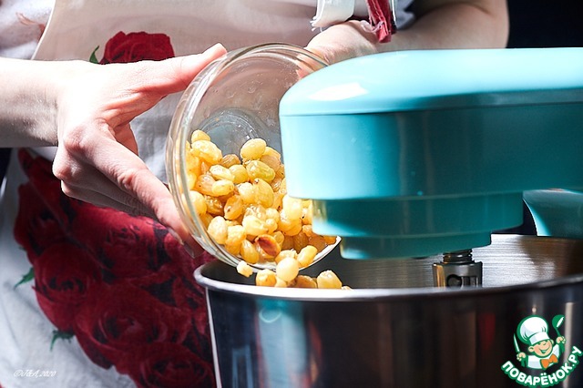 Утром приготовить тесто. Дрожжи на ночь уснут, но потом снова оживут. Изюм откинуть на сито.