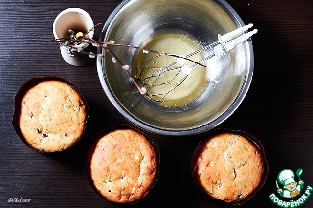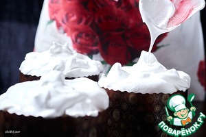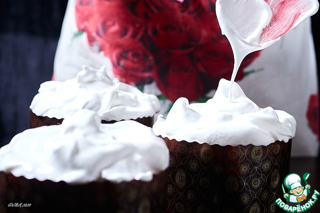 Силиконовой лопаткой обмажьте шапочки куличей нашей меренгой.