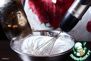 В белок положить 60 гр. сахара. Из 100 гр. и 45 гр воды сварить сироп, довести его до 118С. Белок с сахаром взбить до легкой пены, чтобы не осталось сырого белка. Тонкой струйкой вливать сироп, не прерывая взбивания. Очень удобно это делать блендером Redmond. Пена постепенно станет глянцевой и тягучей.
