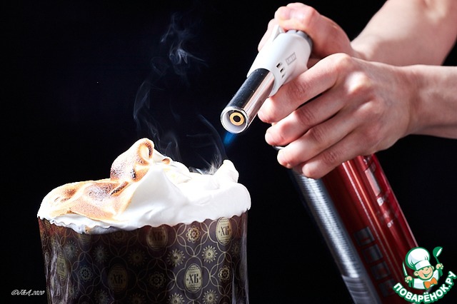 Для полной красоты обожгите меренгу горелкой. Только, пожалуйста, СОБЛЮДАЙТЕ ТЕХНИКУ БЕЗОПАСНОСТИ!