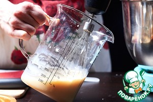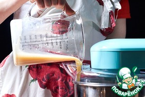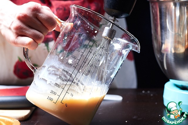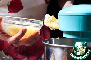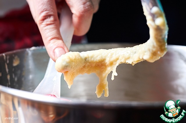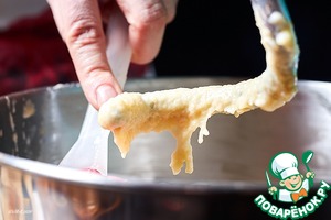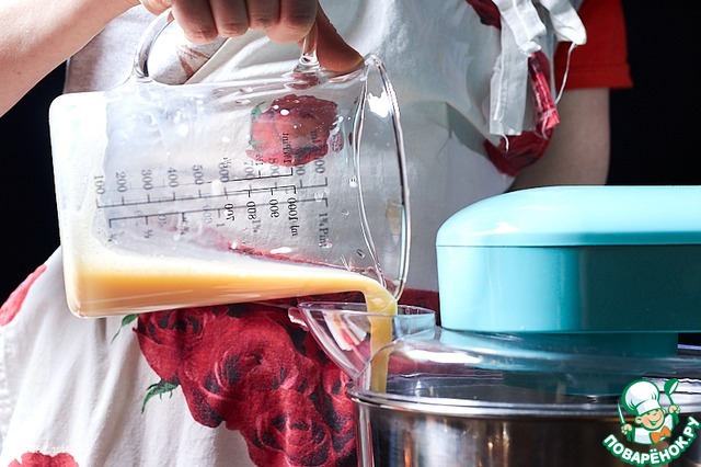 Тонкой струйкой влейте жидкость в сухие ингредиенты. -