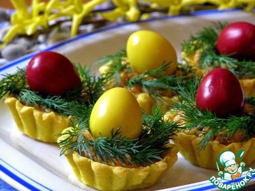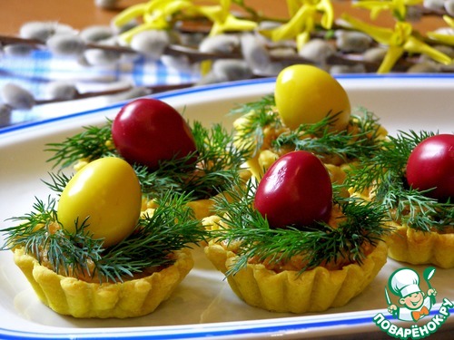 Предлагаю разнообразить свой праздничный стол яркими закусочными тарталетками, изюминкой которых является маринованное яйцо. Особенно эффектно они будут смотреться на пасхальном столе.