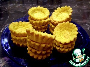 Раскатываем тесто в пласт толщиной примерно 0,5 см. Используя форму для тарталеток, вырезаем из теста круги. Распределяем каждую порцию теста в формочке, накалываем вилкой дно и бока. Формы предварительно не надо смазывать маслом.