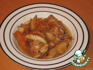 Картофель почистить, помыть и крупно нарезать, обжарить в том же масле, где жарилась курица.