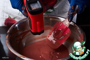 Шоколад снова перелейте в миску. Помешивая зачерпывающими движениями довести шоколад до температуры 33С. Я измеряю электронным бесконтактным пирометром. Можно купить в любом строительном магазине.
