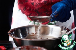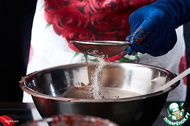 Через мелкое сито просеять в доведенный до нужной температуры шоколад какао-масло Mycryo. Это какао-масло в виде порошка. Пропорция 1% от массы шоколада в миске. На 2 яйца ушло около 220-250 гр, пока рука не набита шоколада уходит много, постепенно привыкается и становится проще регулировать толщину стенок и скорость застывания. Пока берем максимум- 250, а значит Mycryo нам нужно 2,5, а для верности 3 гр, тут тоже лучше чуть больше, надежнее.