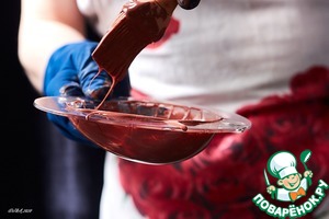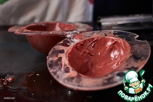 Поликарбонатные формы для шоколада как следует вымойте и протрите безворсовыми салфетками. Нанесите шоколад либо кисточкой, либо налив его внутрь формы и энергично покачивая распределите его по стенкам. Идеальная толщина скорлупки такого размера (10 мм * 7 мм) 1,5-2 мм. Получится не с первого раза, но дело техники. Излишки слить в чашу мультиварки, они нам понадобятся, мы их снова темперируем для следующих.
