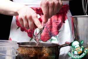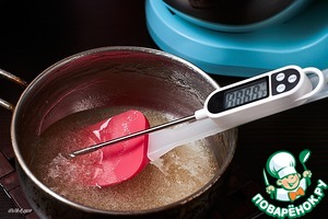 Варить на среднем огне до температуры 110С. Как дойдет до нужной температуры, снять с огня и дать остыть до 80С, периодически помешивая, чтобы не образовалась корочка.