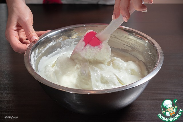 Белки взбейте с сахаром (70 гр из оставшегося количества). Я делала это блендером Redmond, постепенно подсыпая сахар в процессе взбивания.