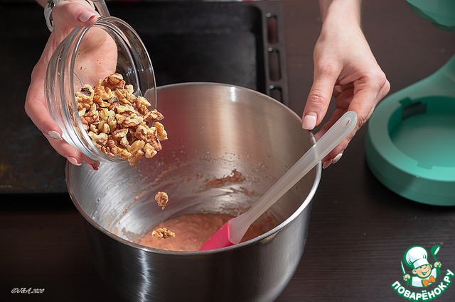 Туда же добавить морковь и орехи. Орехи перед этим обжарьте.