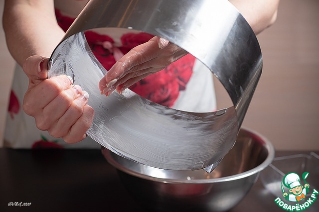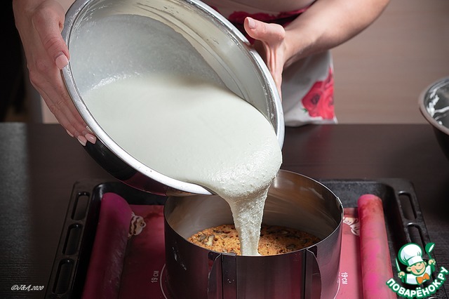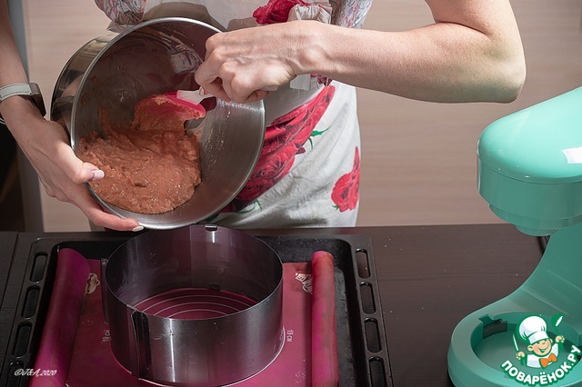 Выложить в форму диаметром 19 см. Бока слегка смазать маслом. На дно постелить пергамент или выпекать на силиконовом коврике.