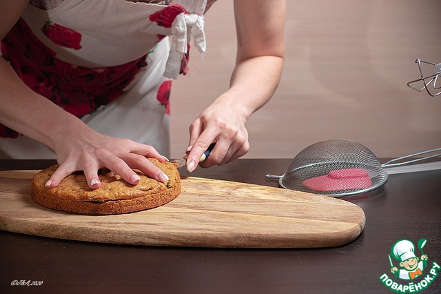 Выпекать при 180С до готовности (проверить зубочисткой). Время зависит от типа духовки. Ее предварительно разогреть. Готовый корж вынуть из формы, горячим завернуть в пленку и положить в холодильник на ночь. На следующий день перед готовкой срезать шапочку.