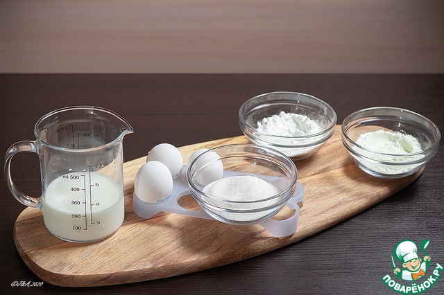Подготовьте ингредиенты для начинки- чизкейка. Нам потребуются яйца (2 белка и 3 желтка), сахар, сухое молоко, молоко, карамельный соус, кукурузный крахмал, и творог. А еще сметана и лимонный сок.