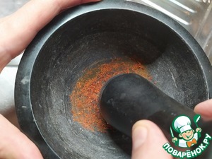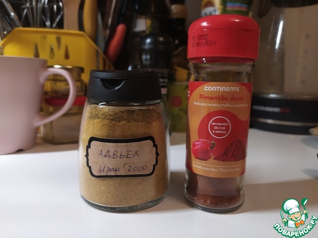 Подготовим специи. Мне нравится добавить 2-3 ложки сладкой паприки. Сейчас в доме есть ещё адвьех, который добавляет приятную пикантность блюду. Но не переборщите, нам всё-таки надо остаться в рамках итальянской кухни.