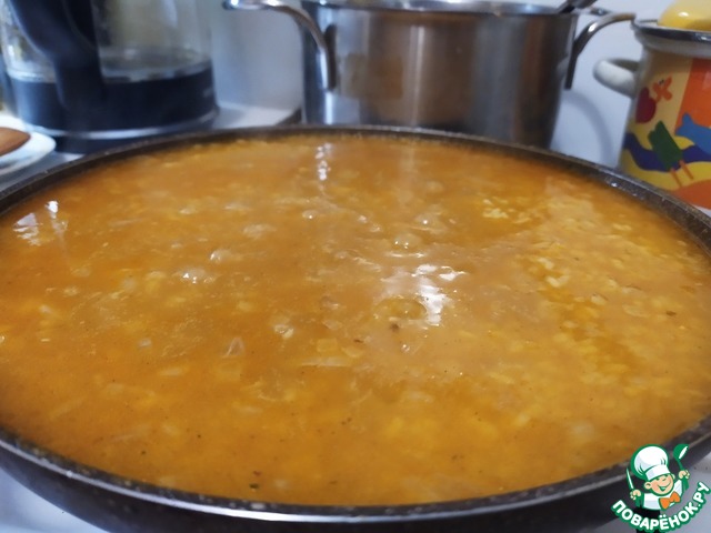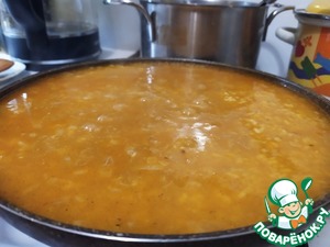 После чего добавляем стакан сухого вина и заливаем бульоном. Солим. Теперь остаётся только наблюдать за тем, чтобы рис всегда был покрыт бульоном.