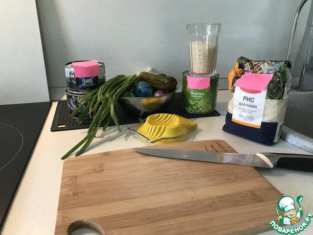 • Рис отварить до готовности в подсоленной воде, откинуть в сито, дать стечь жидкости. Сайру извлечь из консервной банки и размять в салатнике. Поочередно нарубить мелким кубиком яйца и огурцы и вместе с рисом закинуть в салатник. Мелко порубить лук, добавить в салатник.