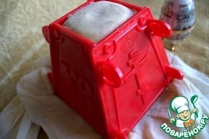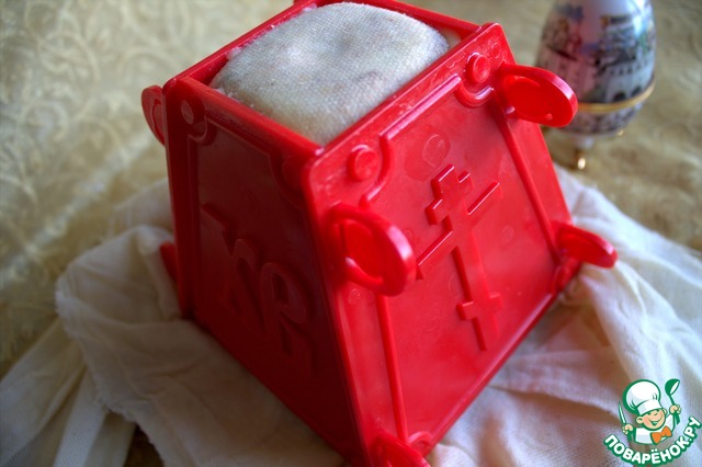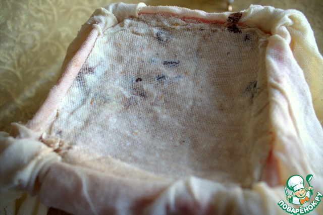 Закрыть концами марли поставить на блюдце гнёт. Мы ставили полный чайник на ночь. Формочку ставить в миску и потом слить сыворотку. Сыворотки около чашки-используем в блины.