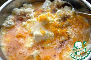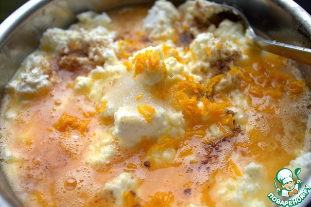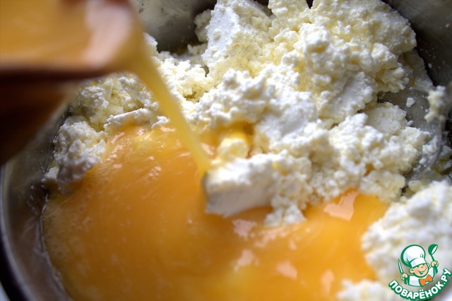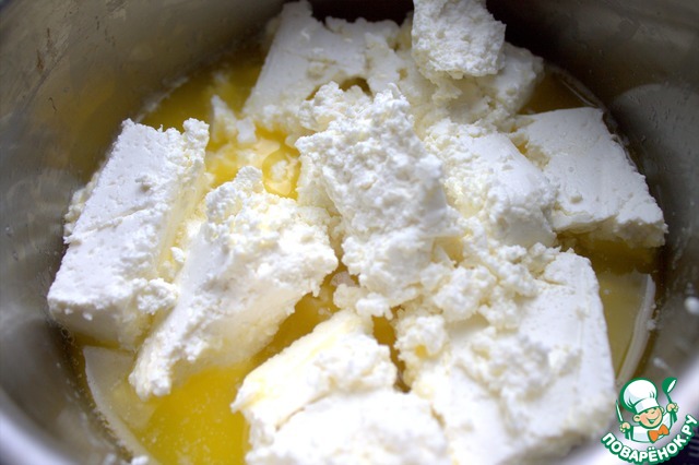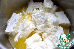 Добавить в масло мелкокрупинчатый творог. У меня 4 пачки по 180 г.