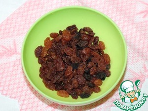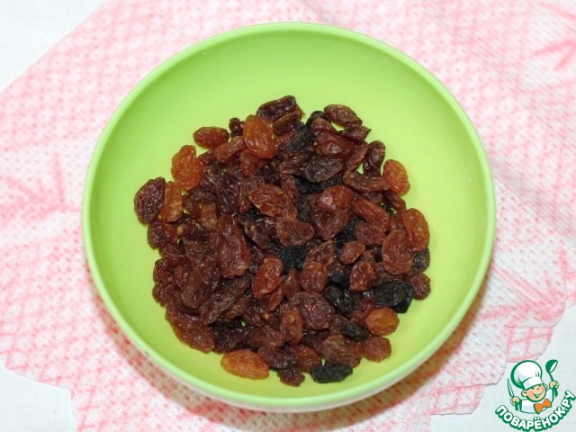 1. Предварительно промойте изюм, залейте теплой водой. Через 20 минут, воду слейте и промокните изюм бумажным полотенцем.