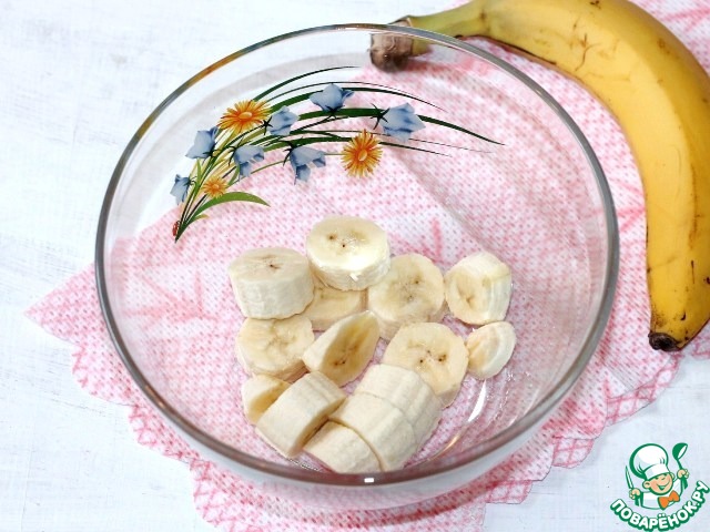 4. Банан очистить от кожуры, порезать на кусочки и измельчить блендером.