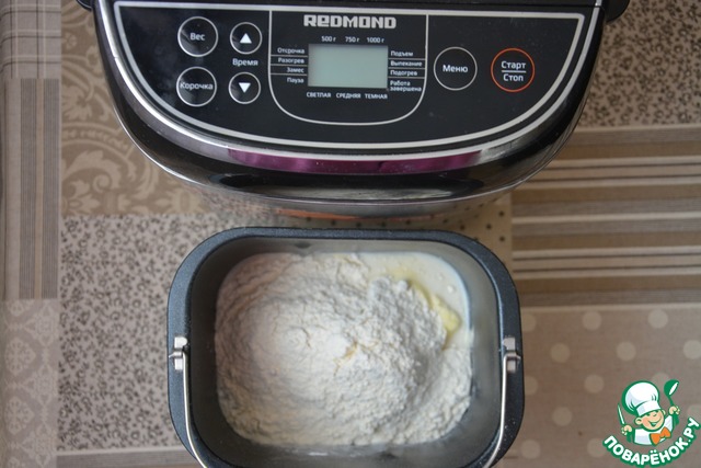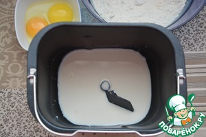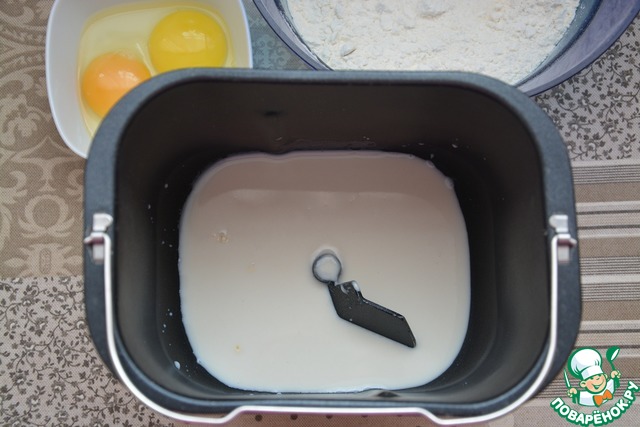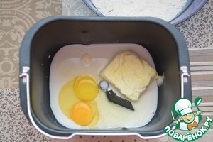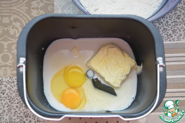 Замес теста доверяю хлебопечке. Конечно же, это можно сделать и вручную. Свежие дрожжи развести в теплом молоке с небольшим количеством муки. Дать настояться 30мин. Если используете сухие дрожжи, то по инструкции к хлебопечке, их закладывают в последнюю очередь.