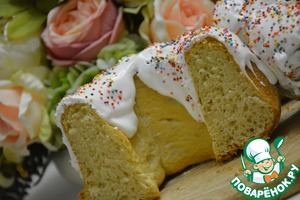 Для глазури оставшийся белок взбить с сахарной пудрой. Украсить ею кекс.