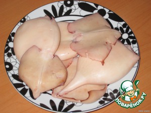 Кальмаров отварить в подсоленной воде 5 минут. Очистить от пленок и хитиновой косточки, промыть.