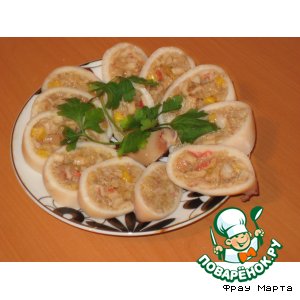 Теперь берем кальмара и фаршируем начинкой. Края зашить ниткой. Отварить в воде 5-7 минут.