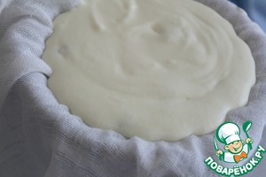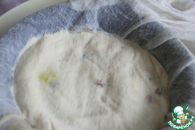 Выложить массу, поставить гнет, поставить емкость под стекающую сыворотку и убрать в холодильник - я поставила на сутки, но не менее 12 часов. -