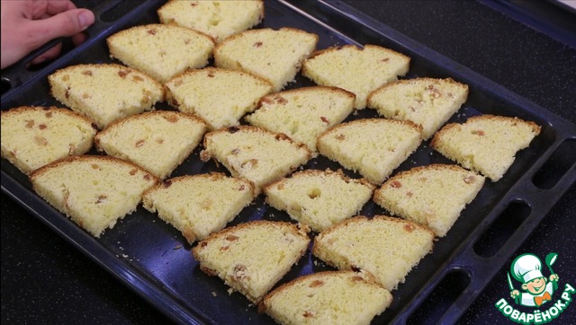Кулич нарезаю кусочками 1-1,5 см. толщиной. Отправляю в духовку подсушиться. Температуру и время регулируйте сами, нужны сухари.