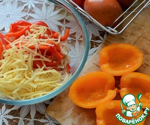 Перец нарезать тонкой соломкой. Смешать аккуратно перец, грудку и сыр.