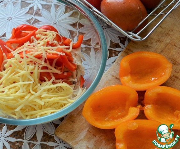 Помидоры порезать пополам и удалить ложкой середину, это "скорлупка для золотых яиц". -
