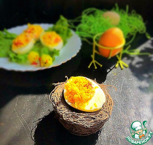 Желтки натереть на мелкой тёрке, украсив "яйца".