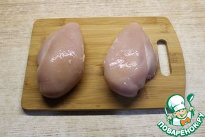 Подготовим куриное филе: грудку хорошо промыть и разрезать на 2 половинки.