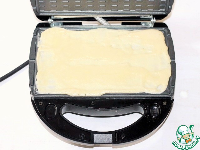 10. Открываем крышку мультипекаря. Форму для выпечки маслом не смазываем. Равномерно выкладываем тесто по 1,5 ст. ложки на 1 порцию и быстро размазываем по прогретой формочке. Закрываем крышку.