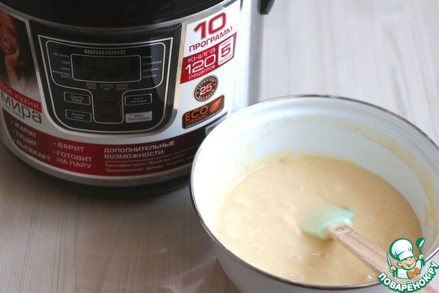 Подготовленное для выпекания тесто добавить в чашу мультиварки Redmond. Выпекать корж в режиме выпечка/хлеб 60 мин. до сухой лучины.