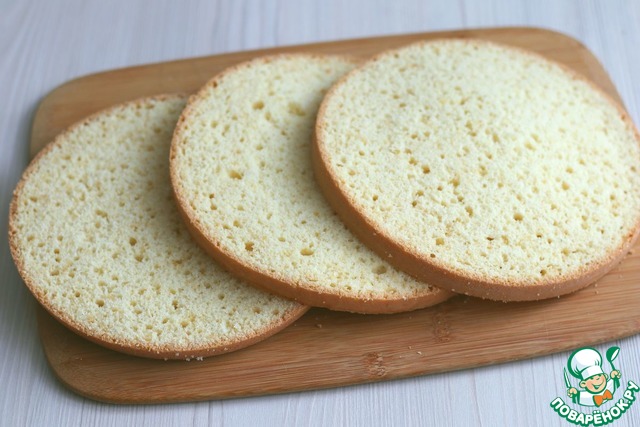 Верхнюю часть бисквита срезать, разломать на кусочки, поместить на противень, отправить в духовку и слегка подсушить/обжарить до золотистого цвета. Затем кусочки бисквита измельчить в крошку при помощи измельчителя. Затем бисквит разрезать на несколько коржей (2-3-4).