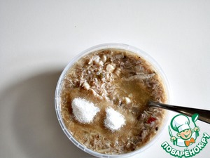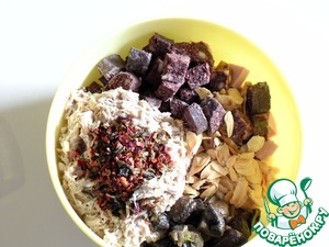 Добавила дольки сухого чеснока, хлопья сладкой паприки, молотый чили и все ингредиенты смешала в одной миске. Соль не добавляла, т. к. все продукты достаточно соленые -