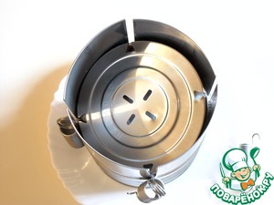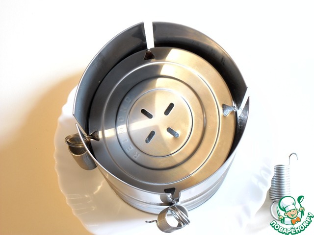 Утрамбовала, закрепила верх пакета, закрыла донышком и закрепила пружинами, согласно инструкции к ветчиннице.