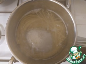 Ставим на огонь спагетти. К моменту готовности соуса они должны быть сварены и откинуты на дуршлаг.