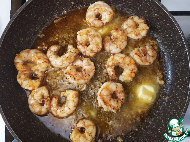 На разогретую сковороду добавляем оливковое масло и креветки. Солим, перчим их и обжариваем (по 1-2 минуты с каждой стороны).