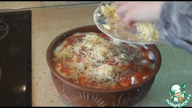 Повторяем ещё раз в той же последовательности: макароны, бешамель, томатный соус, орегано, сыр.