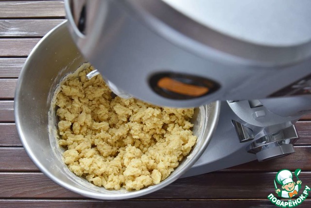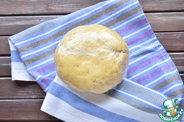 Из получившейся крошки собрать тесто в единый комок. Тесто получается неоднородным и слоистым. Долго месить его не следует, иначе от тепла рук масло начнет таять.