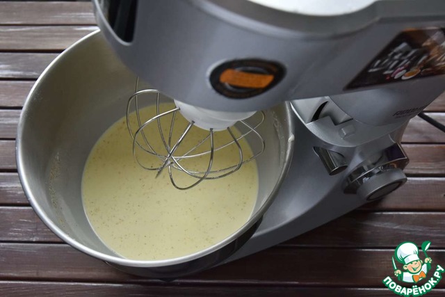 Для заливки смешать молоко, жирные сливки, яйца, соль, куркуму и хорошо перемешать. -