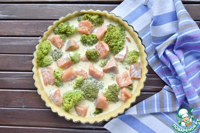Охлажденное тесто достать из холодильника и раскатать по диаметру формы. С помощью скалки перенести тесто и распределить по дну и бокам формы. Излишки теста срезать. Разложить кусочки лосося чередуя соцветиями брокколи, залить подготовленной заливкой.